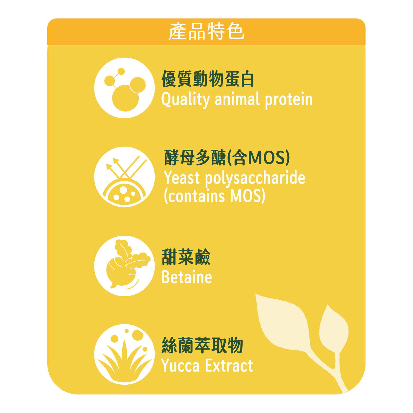 多種新鮮穀物、豆粉、動物性蛋白質、動物性脂肪、綜合胺基酸、螯合礦物質、酵母多醣(含MOS)、甜菜鹼、絲蘭萃取物。