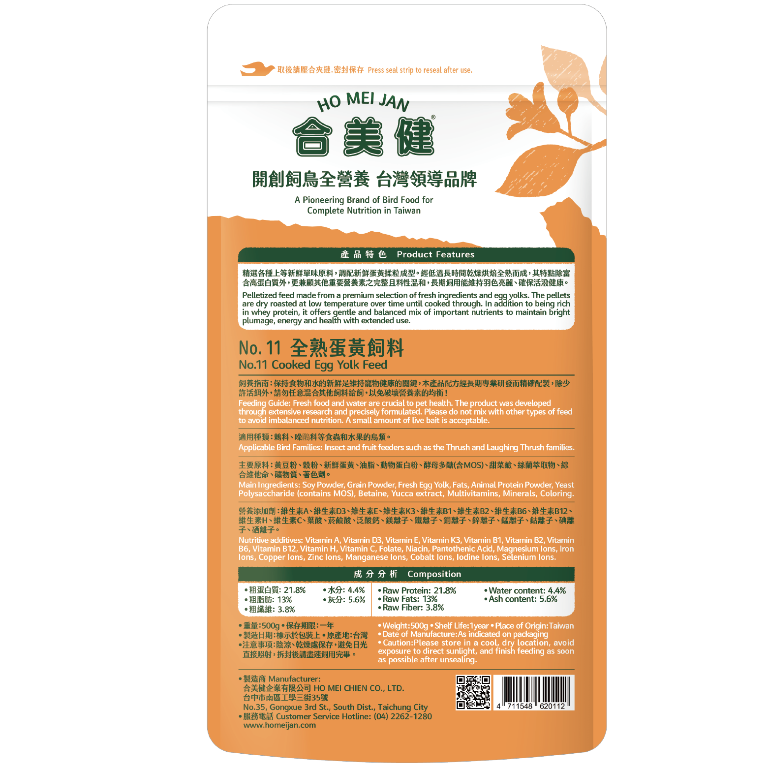 精選各種上等新鮮單味原料,調配新鮮蛋黃揉粒成型。經低溫長時間乾燥烘焙全熟而成,其特點除富含高蛋白質外,更兼顧其他重要營養素之完整且料性溫和,長期飼用能維持羽色亮麗、確保活潑健康。
