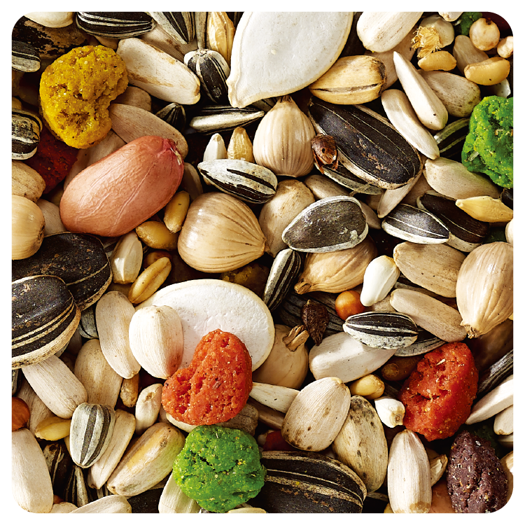 條紋葵花籽、白花籽、白小麥、紅小麥、大麥、白高粱、紅高梁、帶殼蕎麥、燕麥、花生、帶殼薏仁、南瓜籽、核桃、乾燥胡蘿蔔、辣椒、牡蠣殼、滋養丸(含多種新鮮穀物、脫水蔬果粉、植物油、酵母多醣(含MOS)、綜合維生素、胺基酸、螯合礦物質、微量元素、洋車前子、甜菜鹼、絲蘭萃取物、天然水果香精、著色劑)。