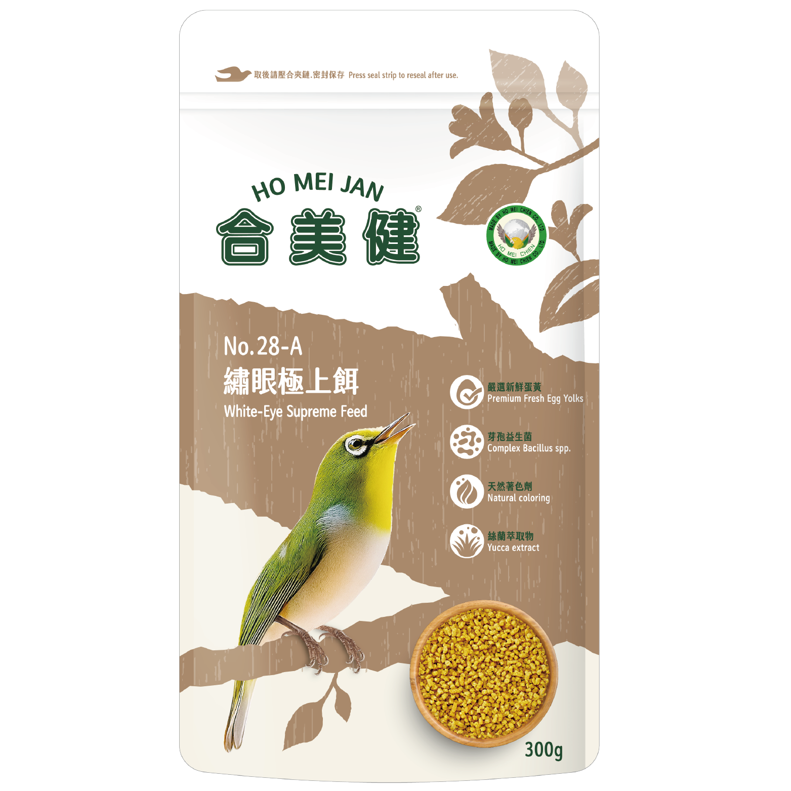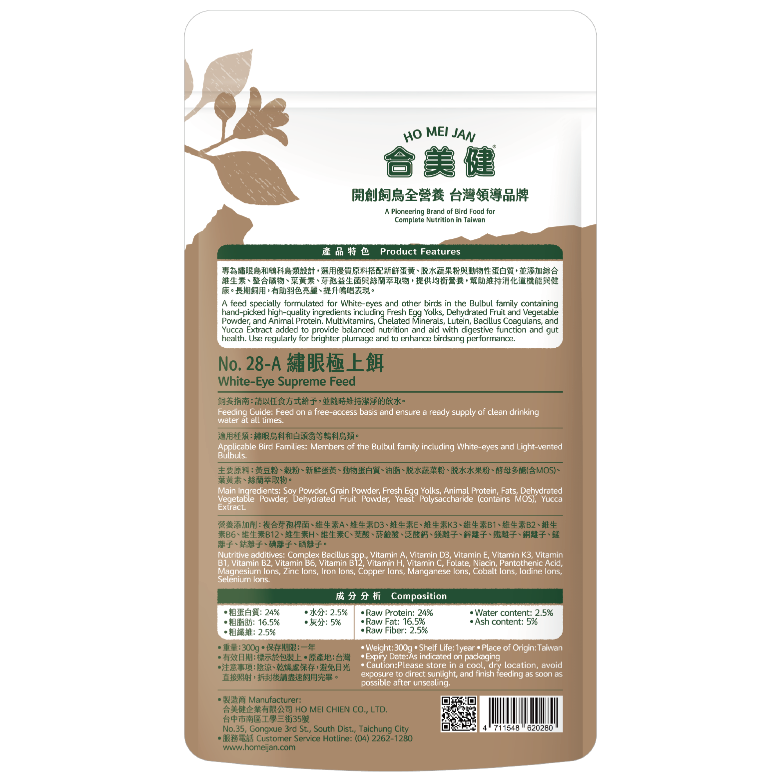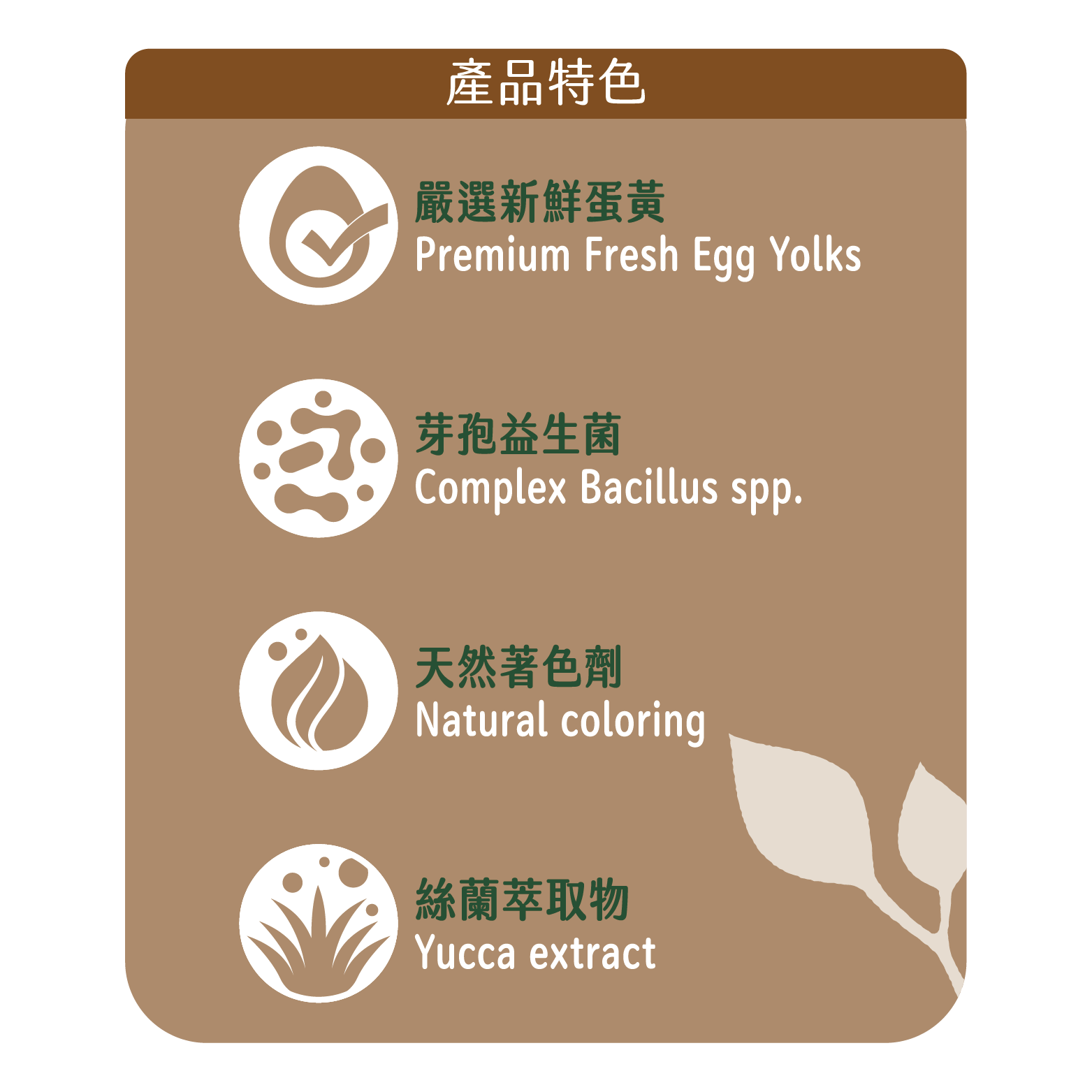 黃豆粉、穀粉、新鮮蛋黃、動物蛋白質、油脂、脫水蔬菜粉、脫水水果粉、酵母多醣(含MOS)、螯合礦物質、葉黃素、絲蘭萃取物。