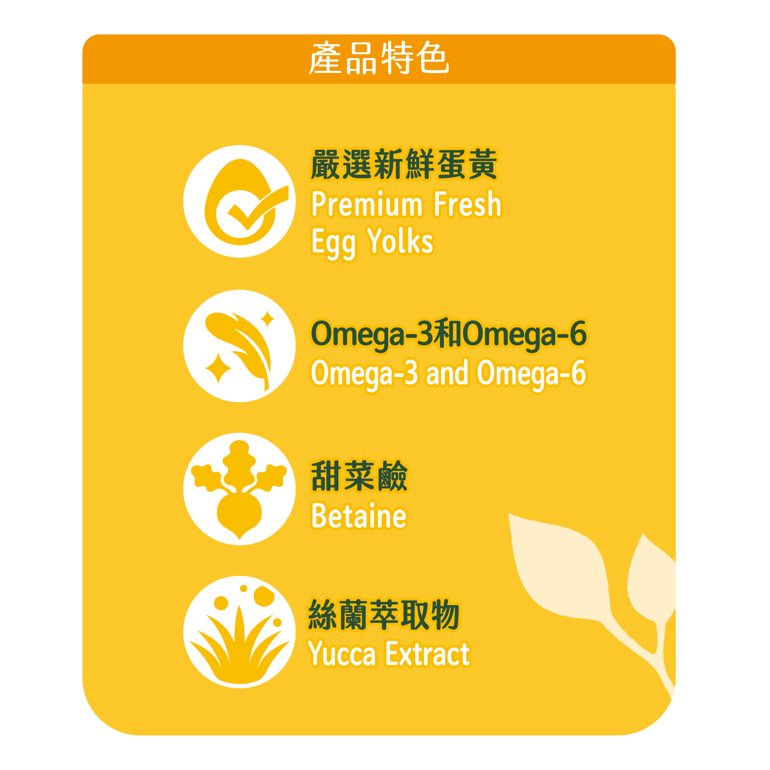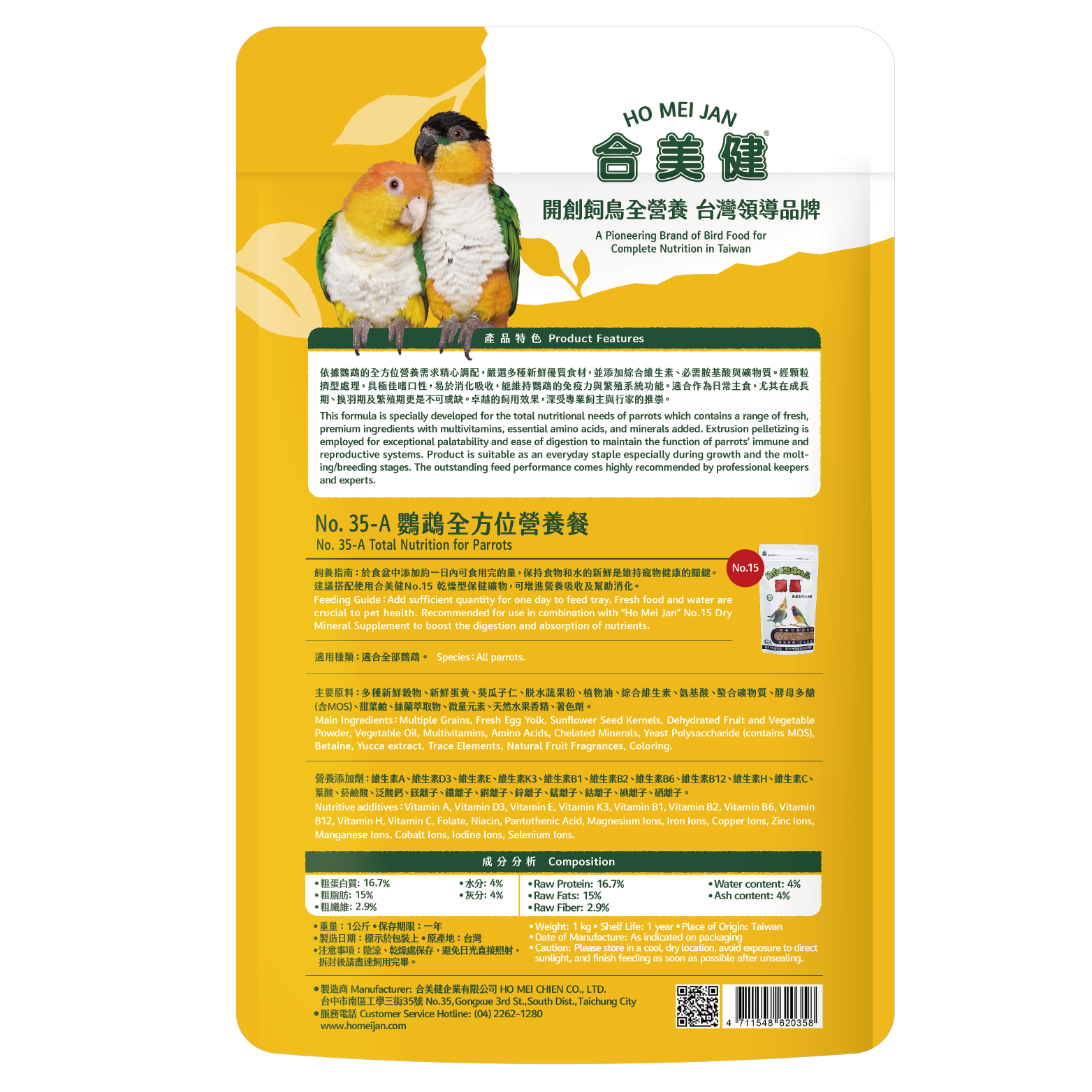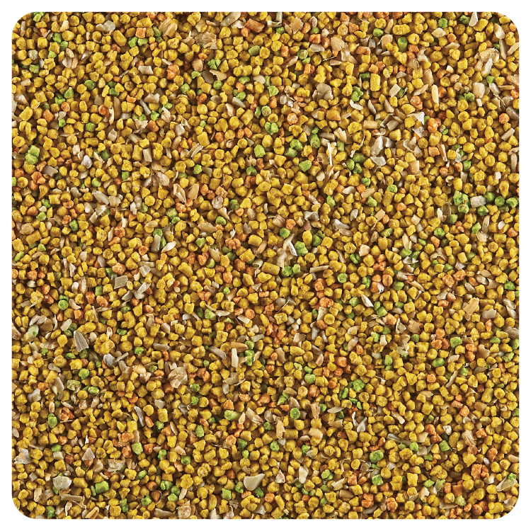 多種新鮮穀物、新鮮蛋黃、葵瓜子仁、脫水蔬果粉、植物油、綜合維生素、胺基酸、螯合礦物質,酵母多醣(含MOS)、甜菜鹼、絲蘭萃取物、微量元素、天然水果香精,著色劑。