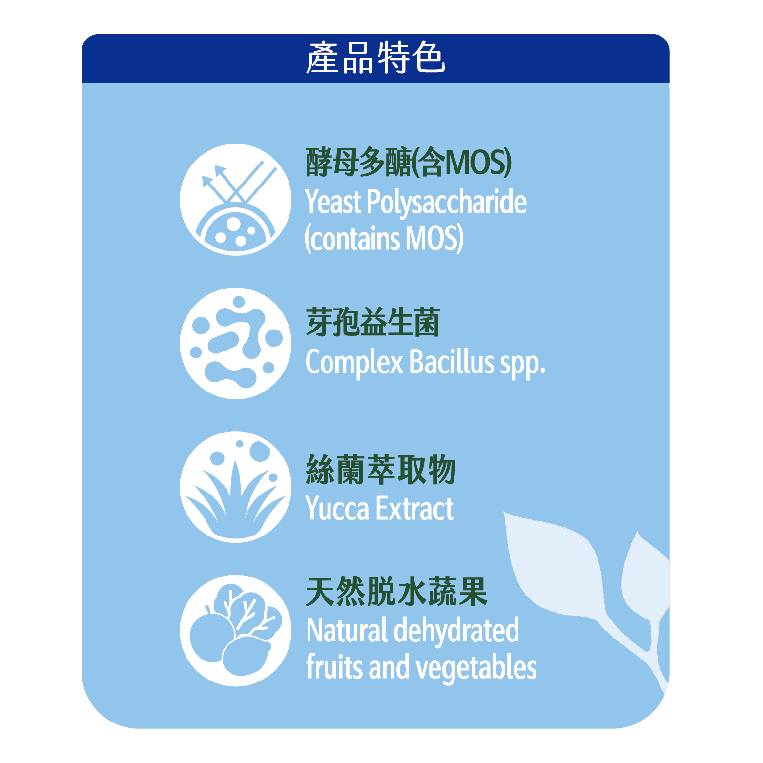 多種穀類、種子、糖、脫水蔬菜粉、脫水水果粉、螯合礦物質、酵母多醣(含MOS)、絲蘭萃取物。